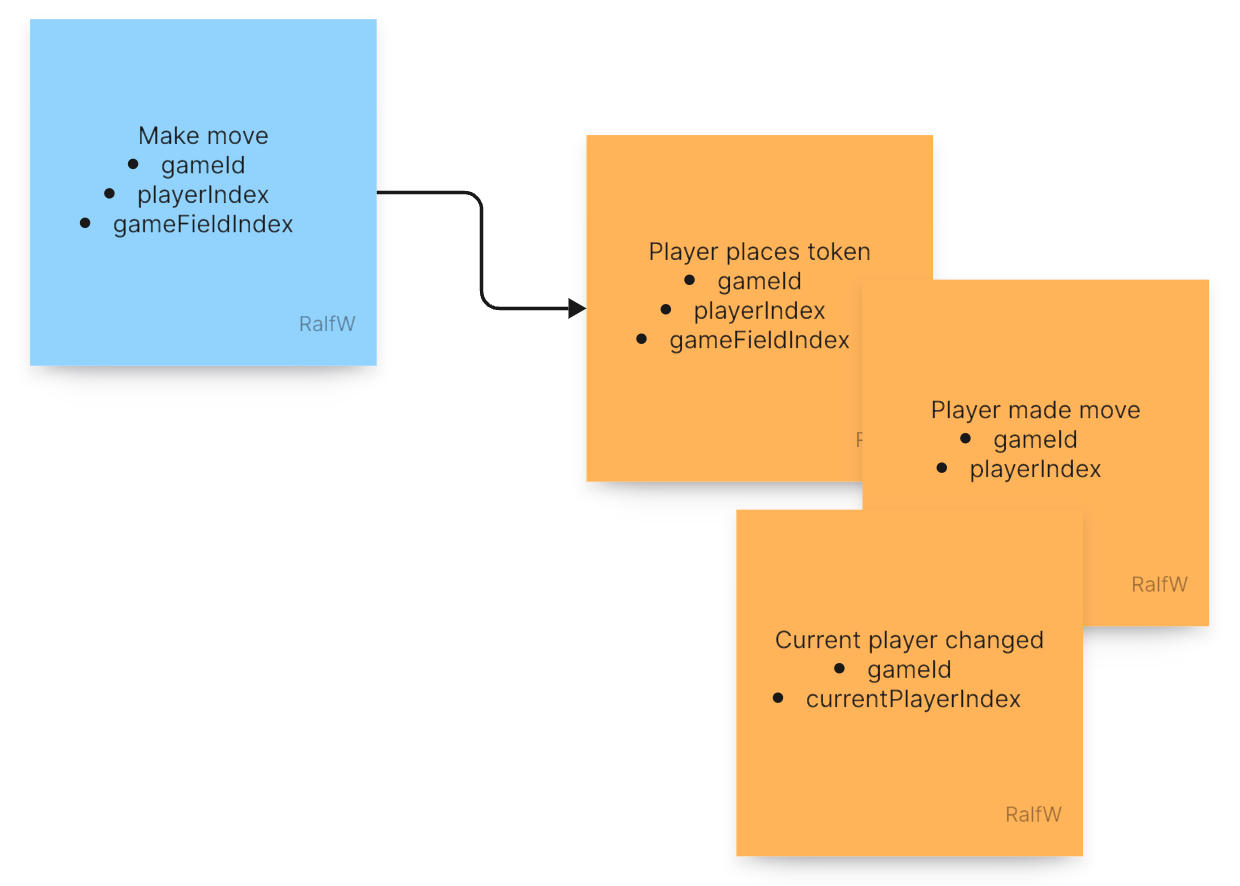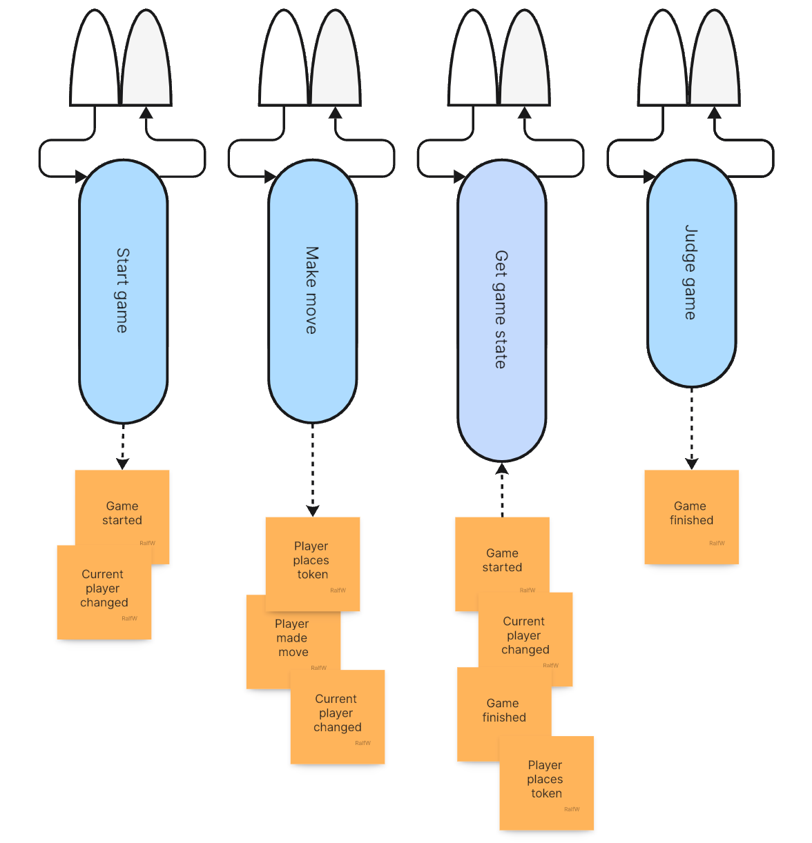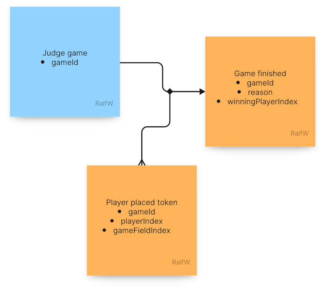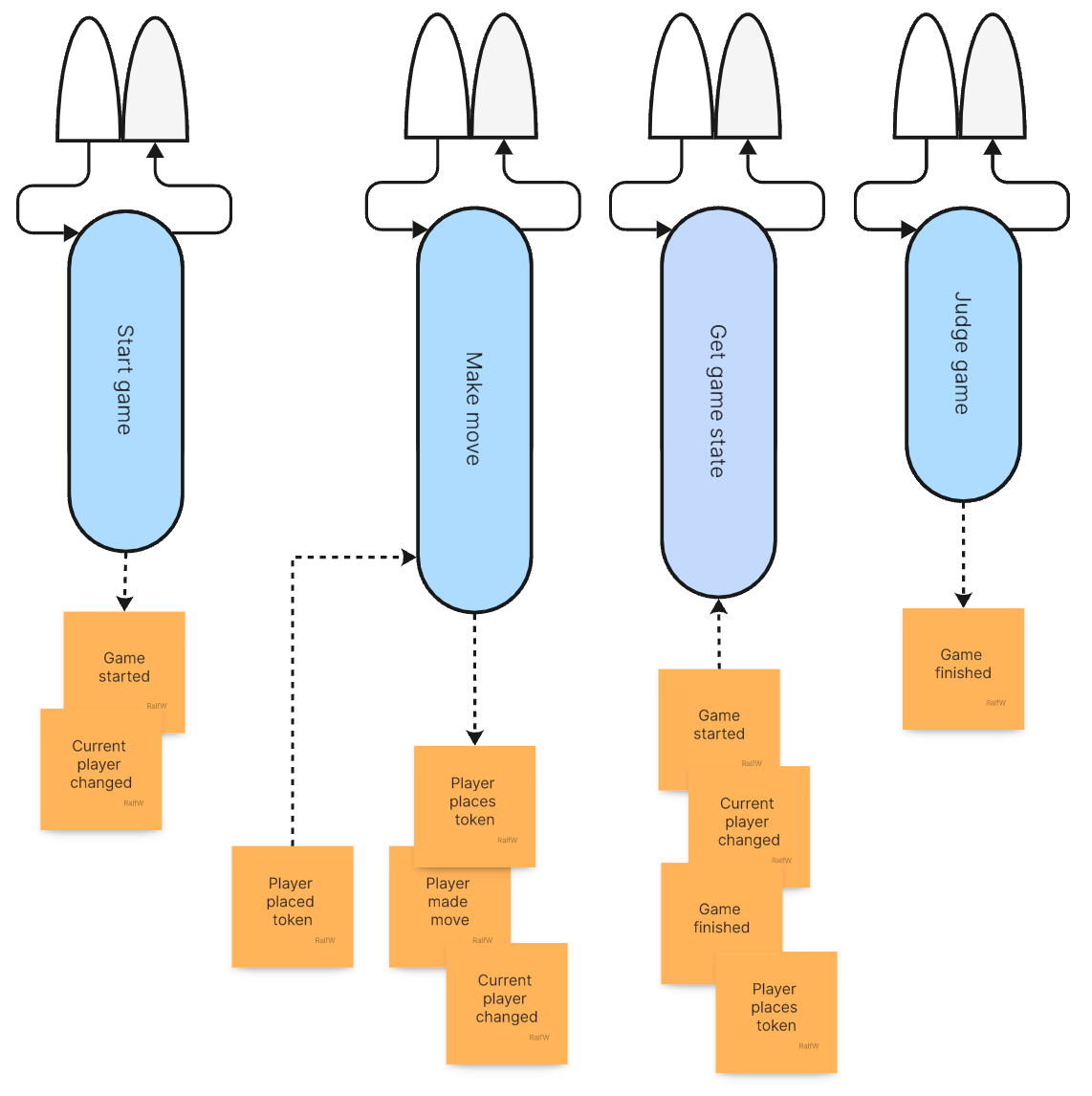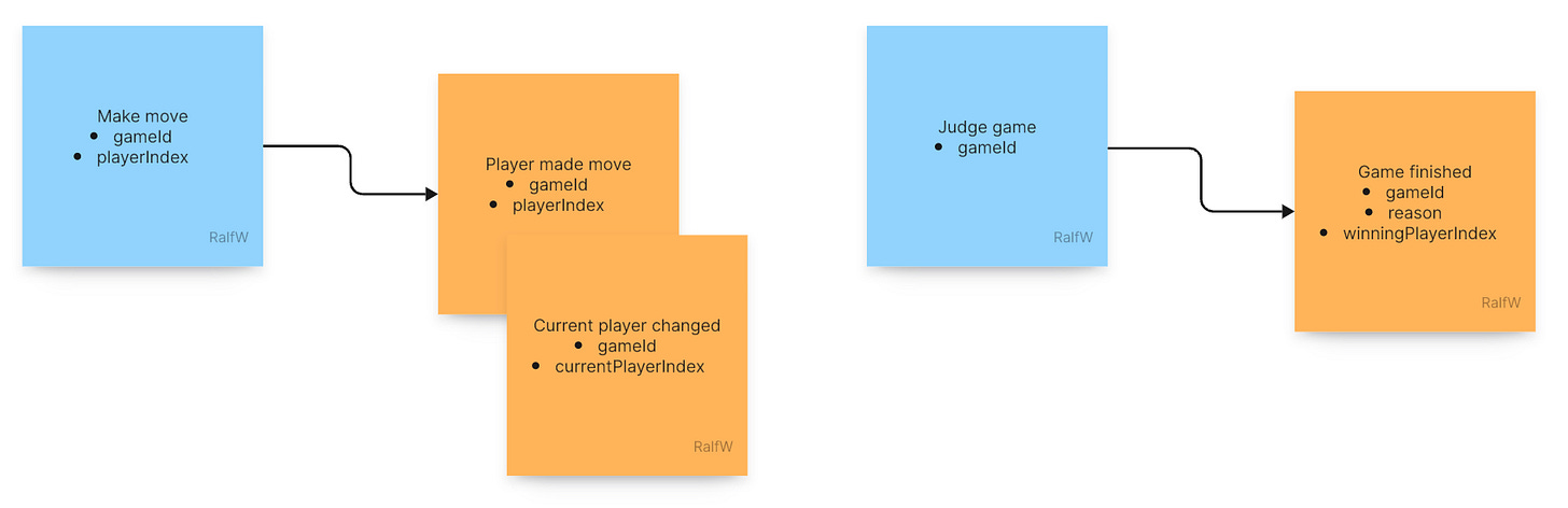 I know from experience in many clean code trainings where I used Tic Tac Toe as an example how tedious discussions about the right representation of the game board and the moves in memory and on disc can be. Darlin has been spared all this due to Event Sourcing, though.