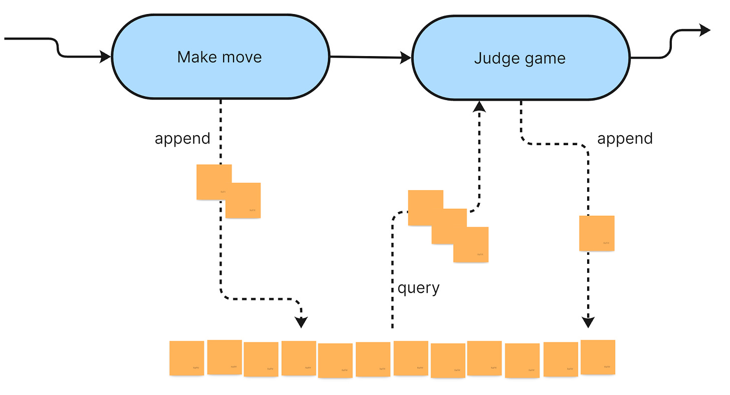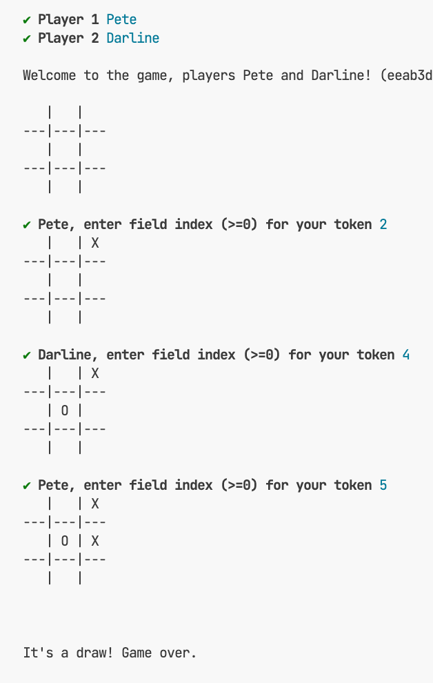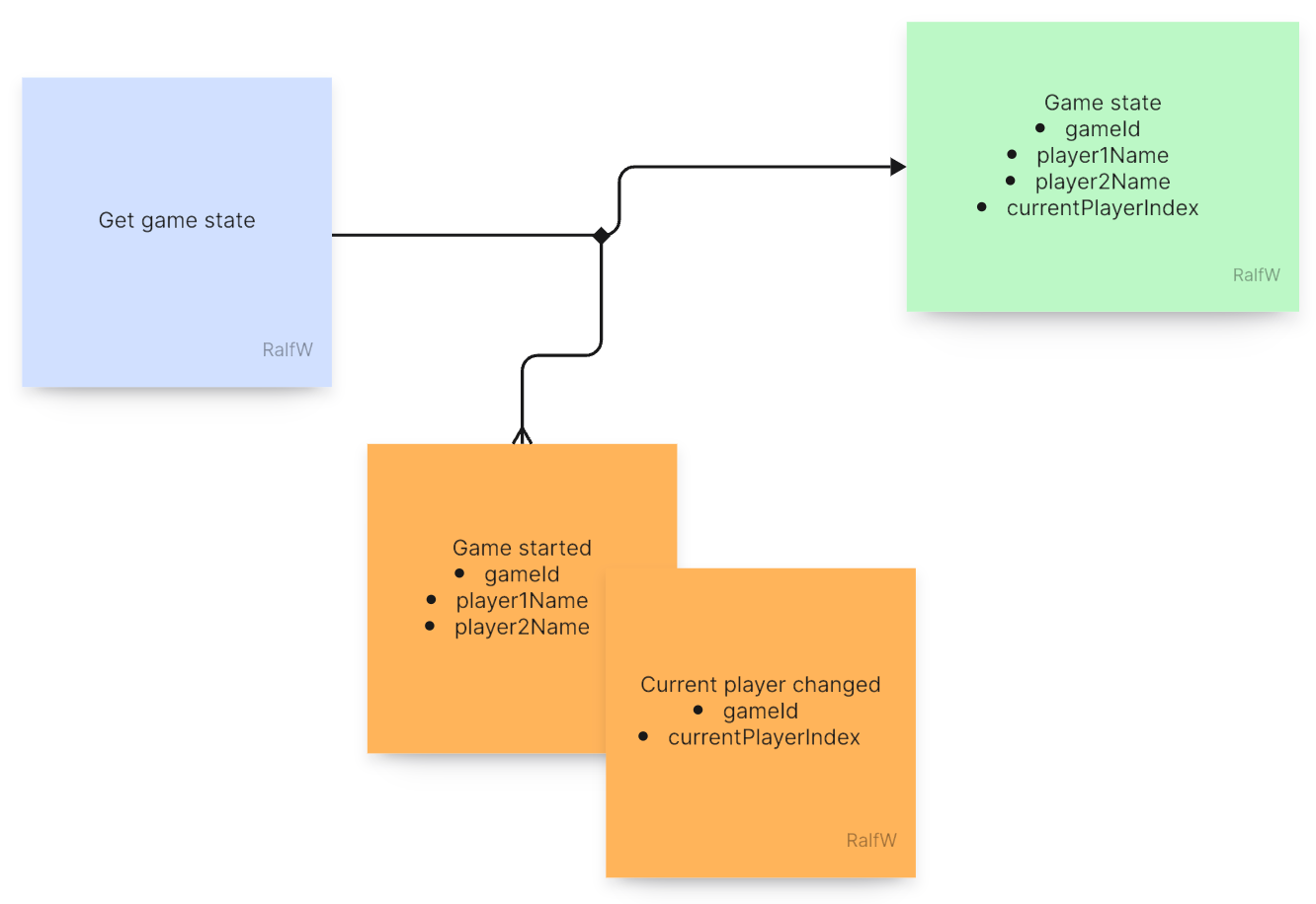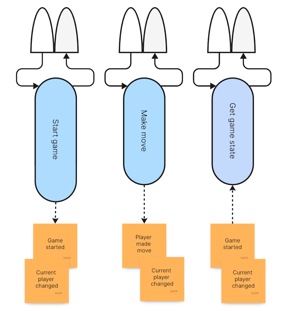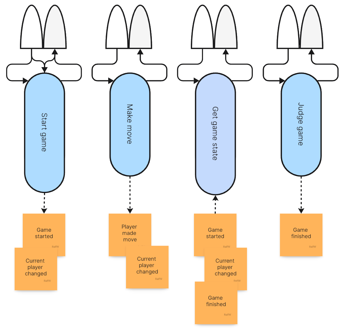 I know from experience in many clean code trainings where I used Tic Tac Toe as an example how tedious discussions about the right representation of the game board and the moves in memory and on disc can be. Darlin has been spared all this due to Event Sourcing, though.