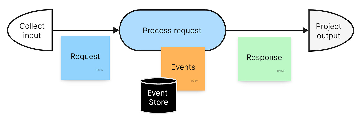 And that’s also the basic architecture for an event sourced application. Following the CQS principle Darline will identify the relevant request in each increment — there should only be one —, and create (or look up) the requesting handling slice in code.