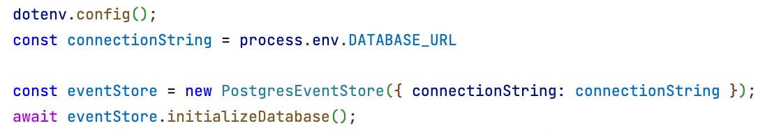 There’s no database to talk about. The Event Store is as it is: a simple two function persistence API. All schema design is done by defining the events. Nothing to maintain in terms of a database. As shown above it boils down to choosing the medium — here: a Postgres database — and instantiating an EventStore