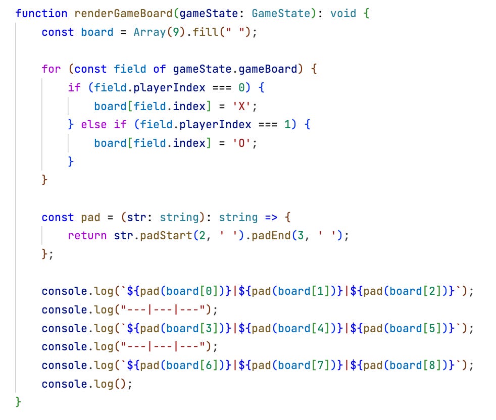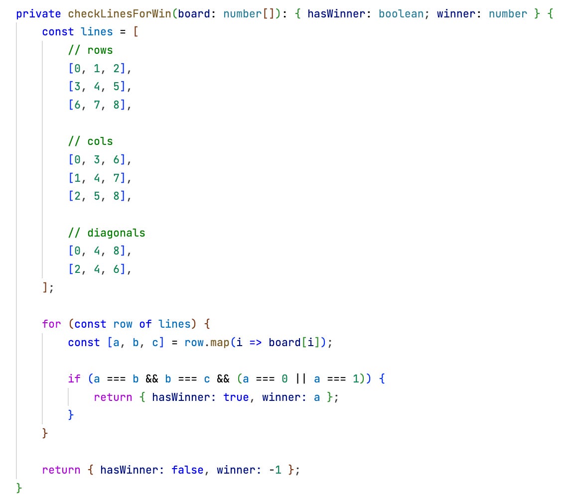 The business logic to check for a win or draw she puts in a pure function — checkLinesForWin()