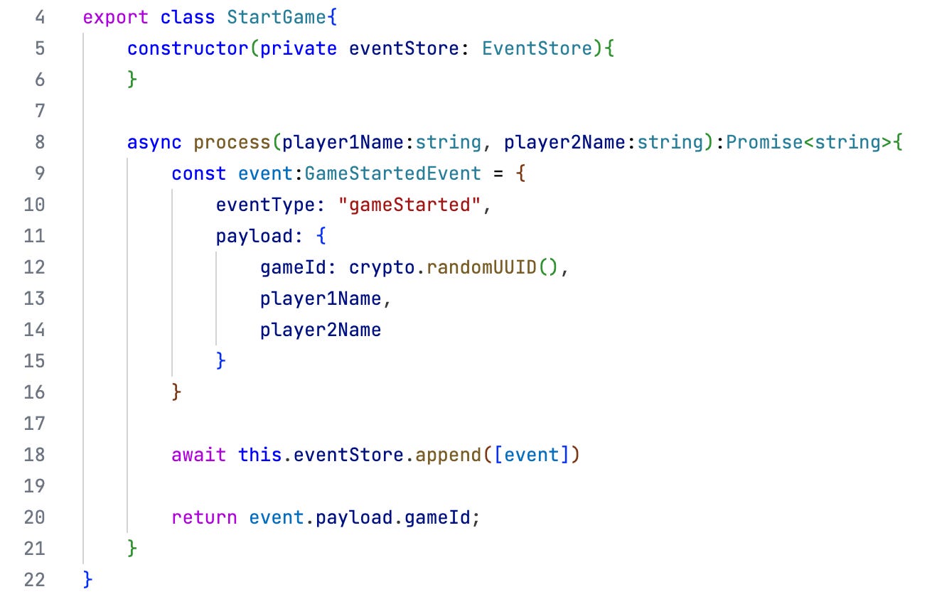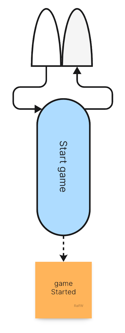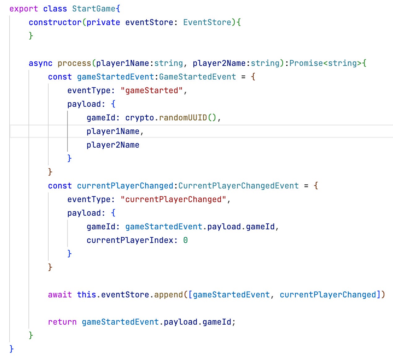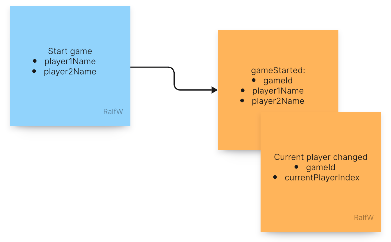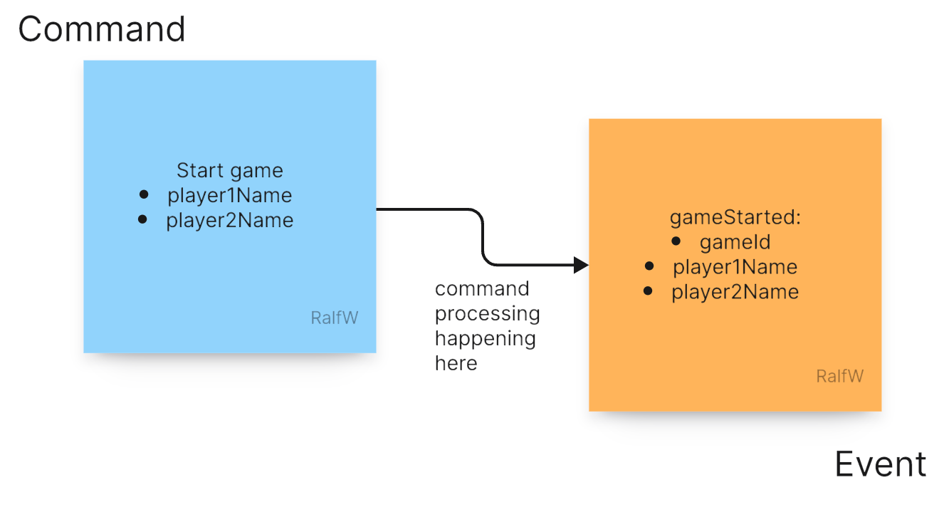 The command in Pete’s requirements is obvious: Start a game! It has two parameters: the names of the players, StartGame(player1Name, player2Name)