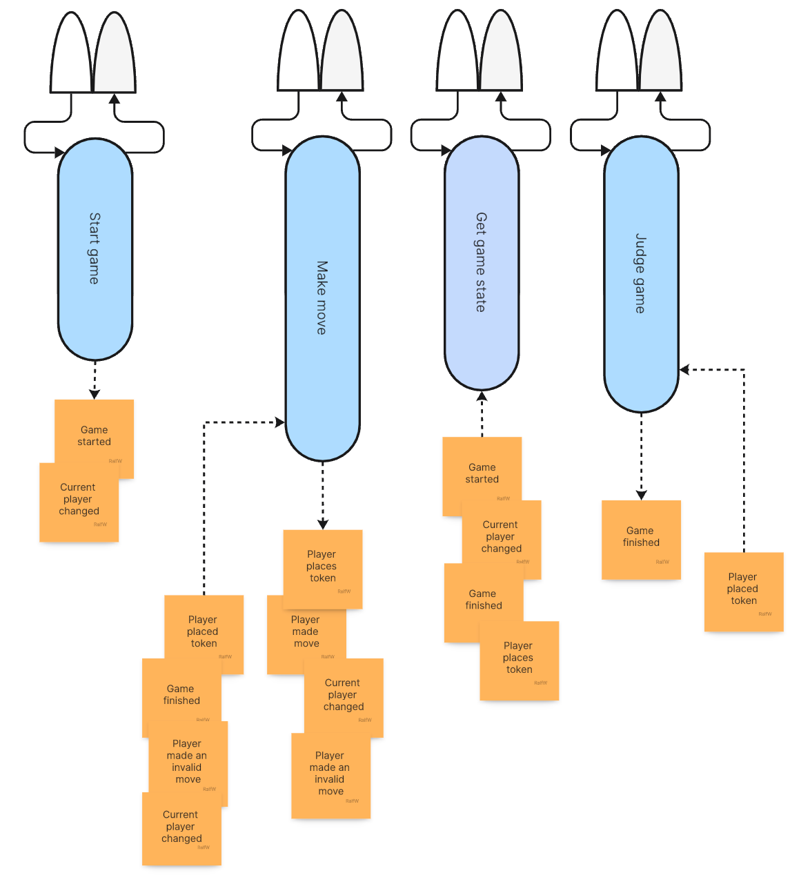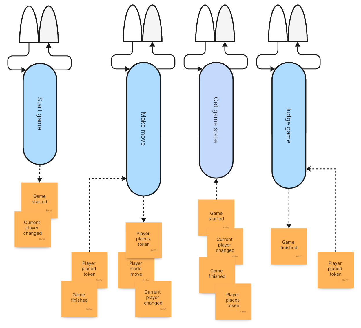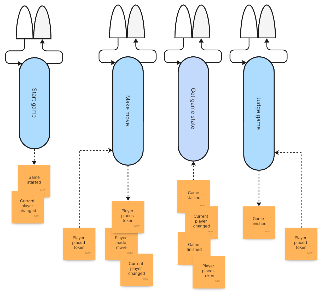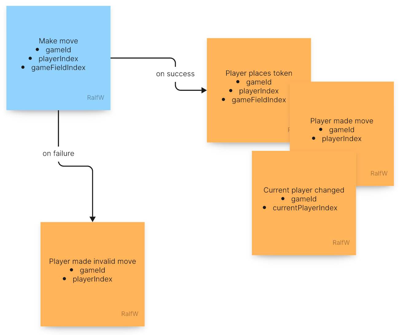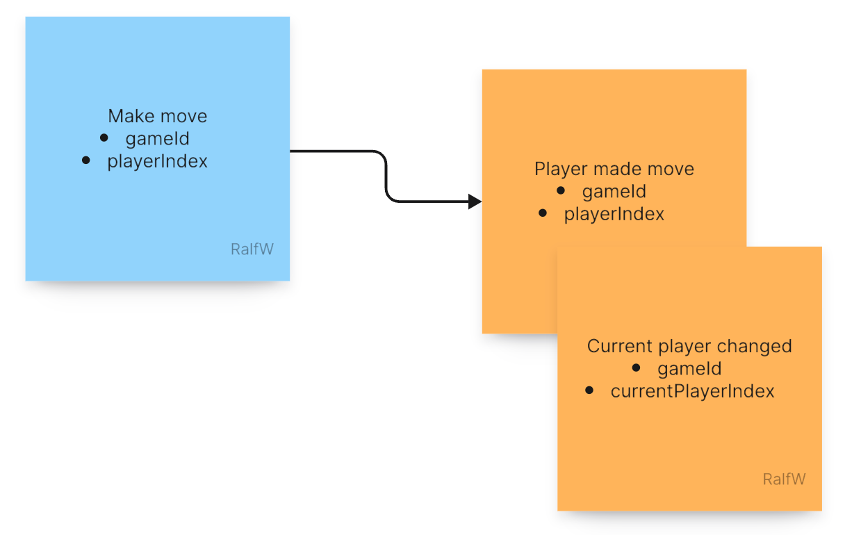 Or to make it a bit more visual you can use post-it notes to design the requests and events of an application like this. Keep your thinking independent of code a little longer.