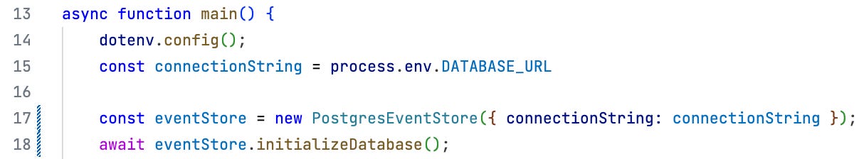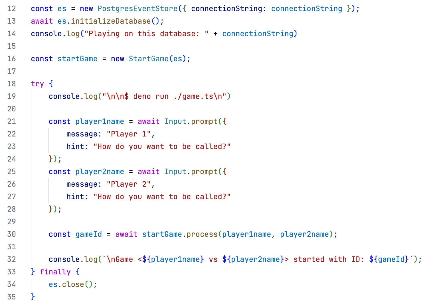 The storage engine underlying the Event Store is Postgres. But that’s not really important. I would have liked to use an in-memory Event Store, but it hadn’t been finished at time of writing the article (see update at end of article). Except for these lines at the beginning of the main script file nothing depends on Postgres.