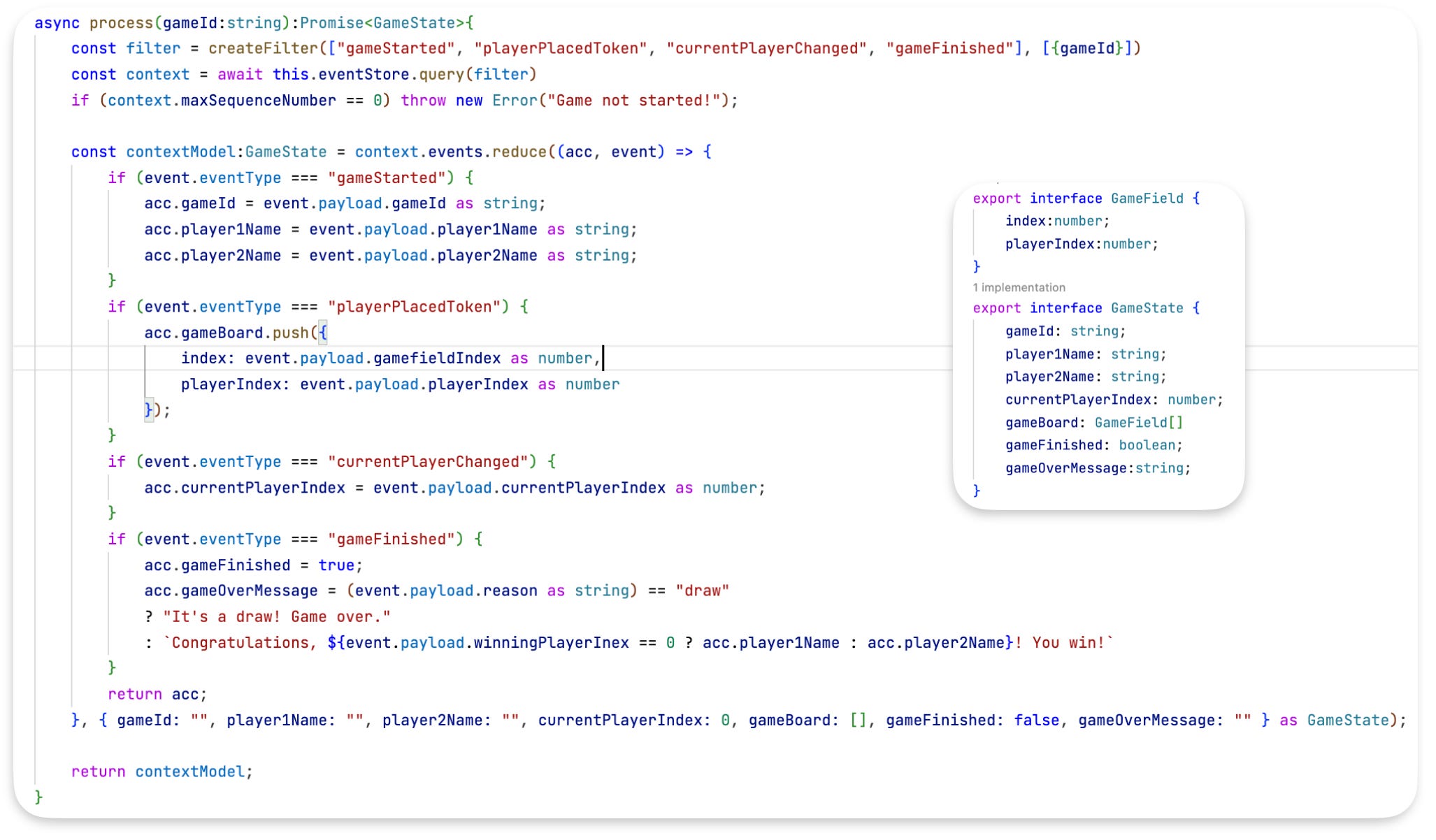 More interesting is the storage paradigm Darline chose. It’s Event Sourcing done with Rico Fritzsche’s and my small, simple, straightforward, no frills Event Store (also implemented in Typescript). It’s open source. Check out the Github repository here: https://github.com/ricofritzsche/eventstore-typescript.