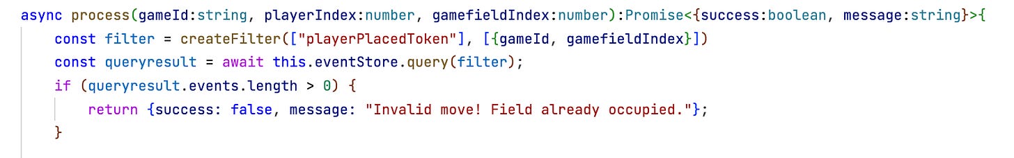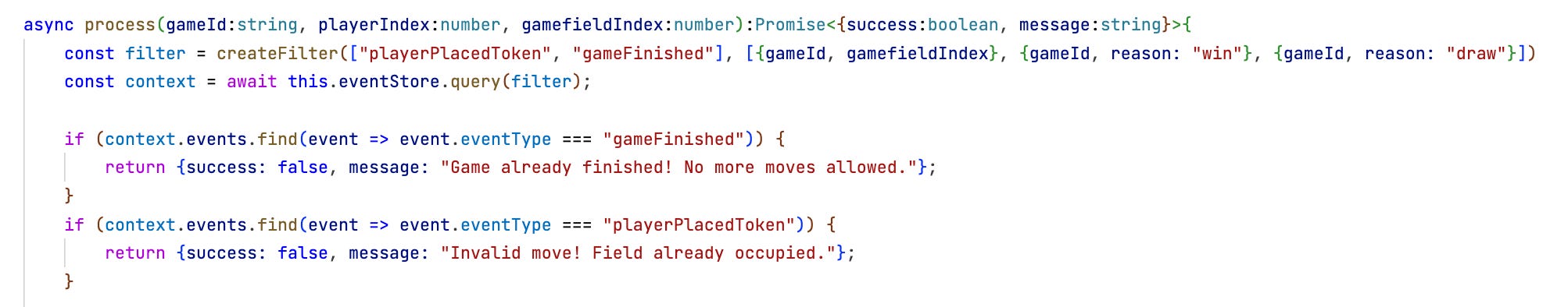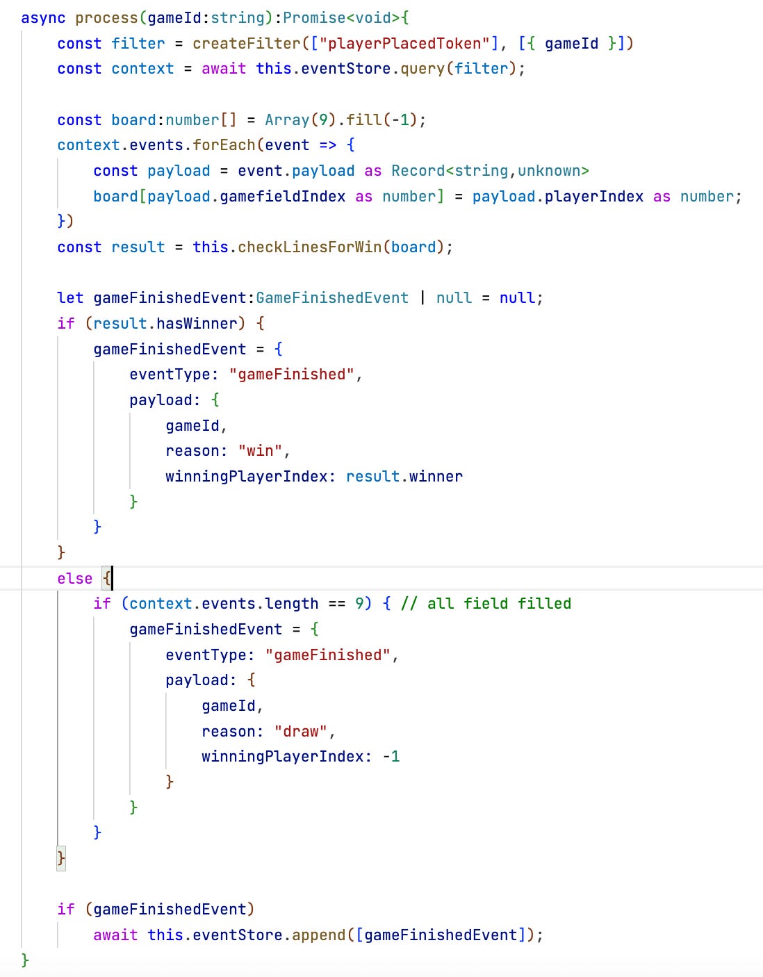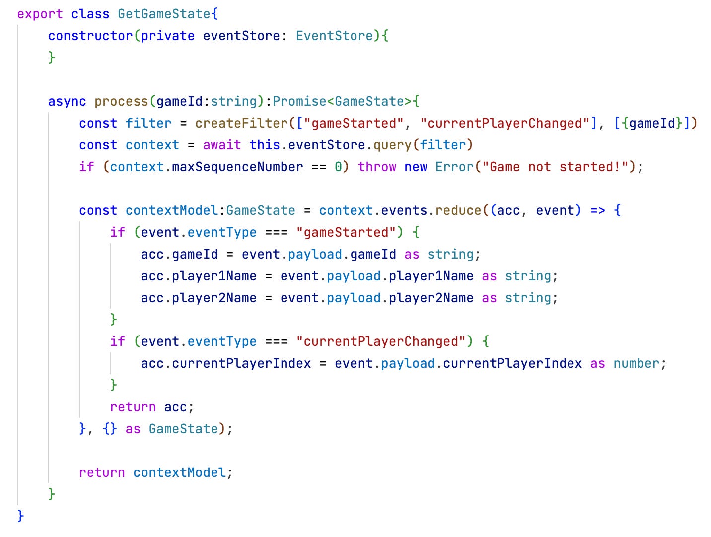 In a more distributed project (more developers working on more slices which then run in different services in parallel) it might be wise to check that first, though. The GameFinished event would be included in the filter and first looked for in the context returned from query()