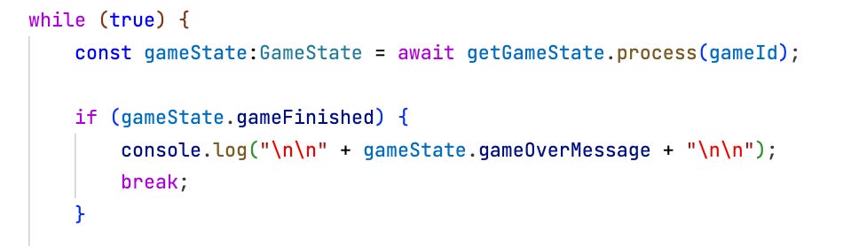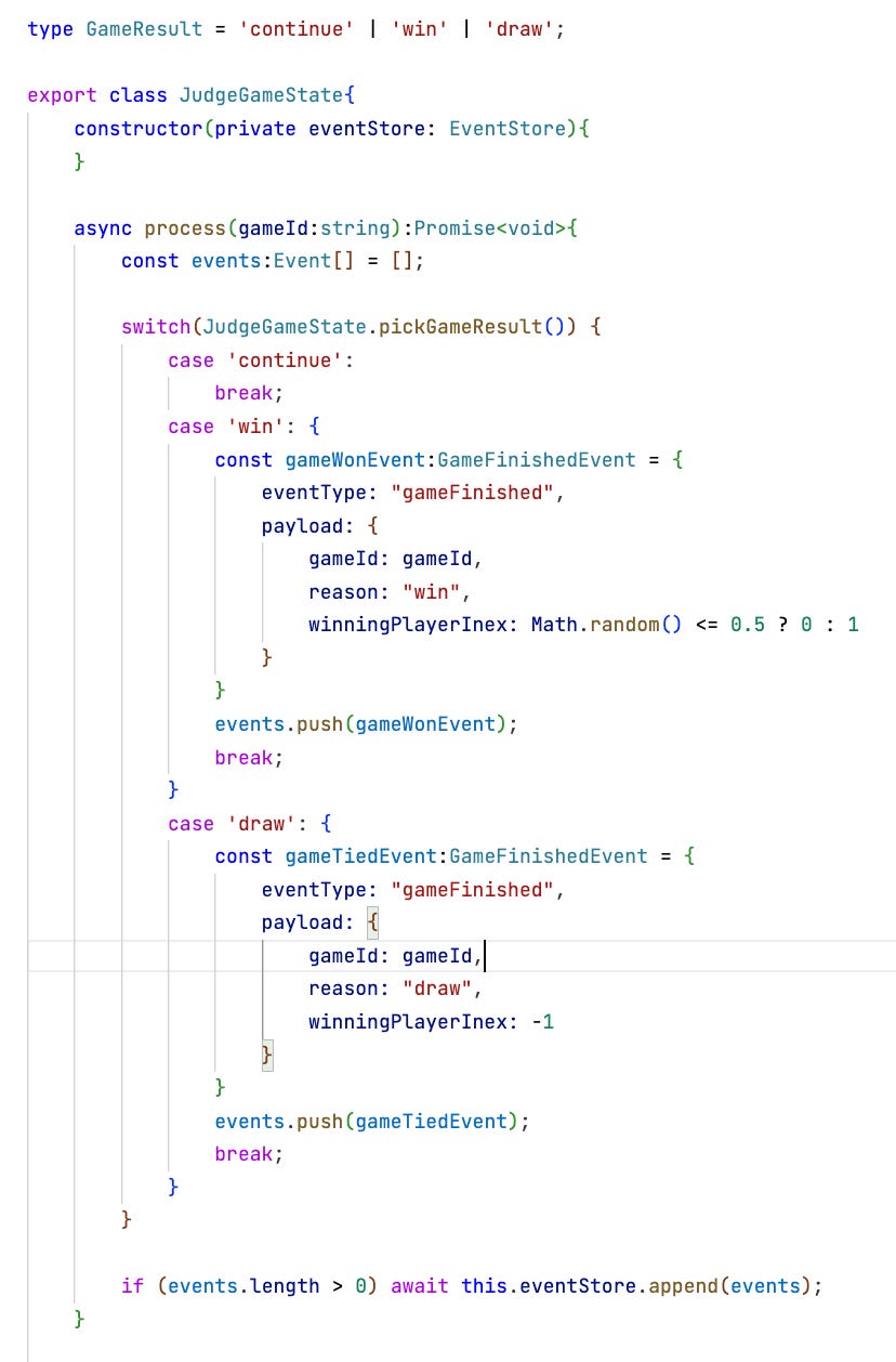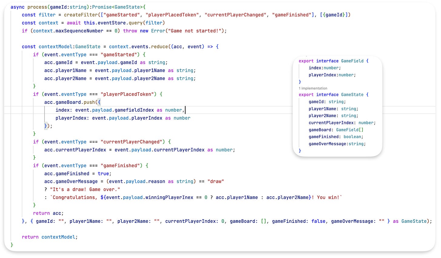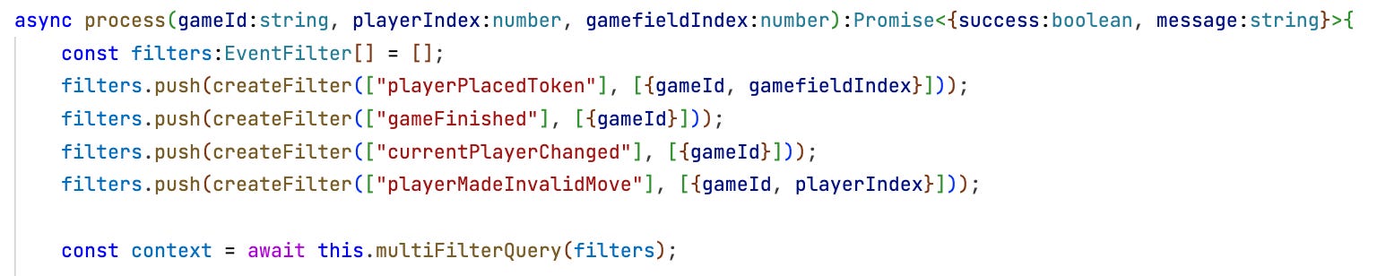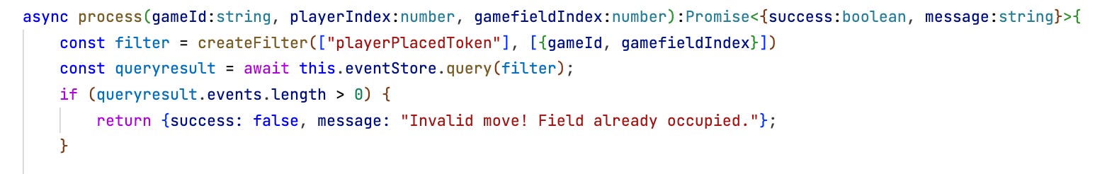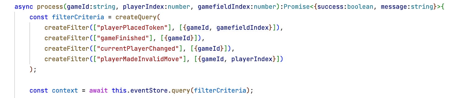 In a more distributed project (more developers working on more slices which then run in different services in parallel) it might be wise to check that first, though. The GameFinished event would be included in the filter and first looked for in the context returned from query()