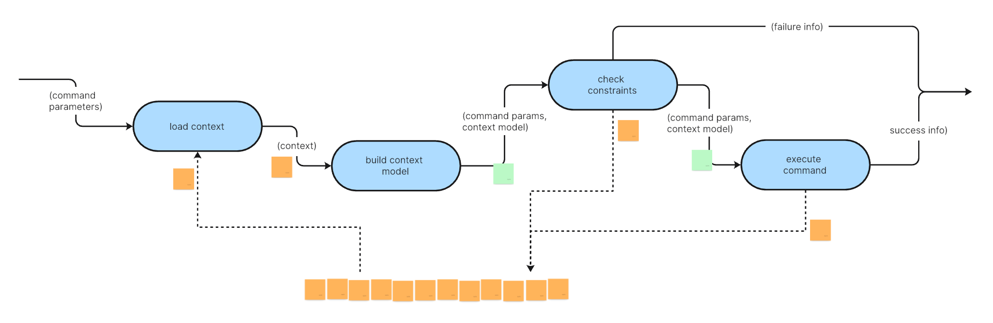 Commands query the event stream for a context, build a context model, check constraints, serve the request, and finally append some events to record any application state changes.