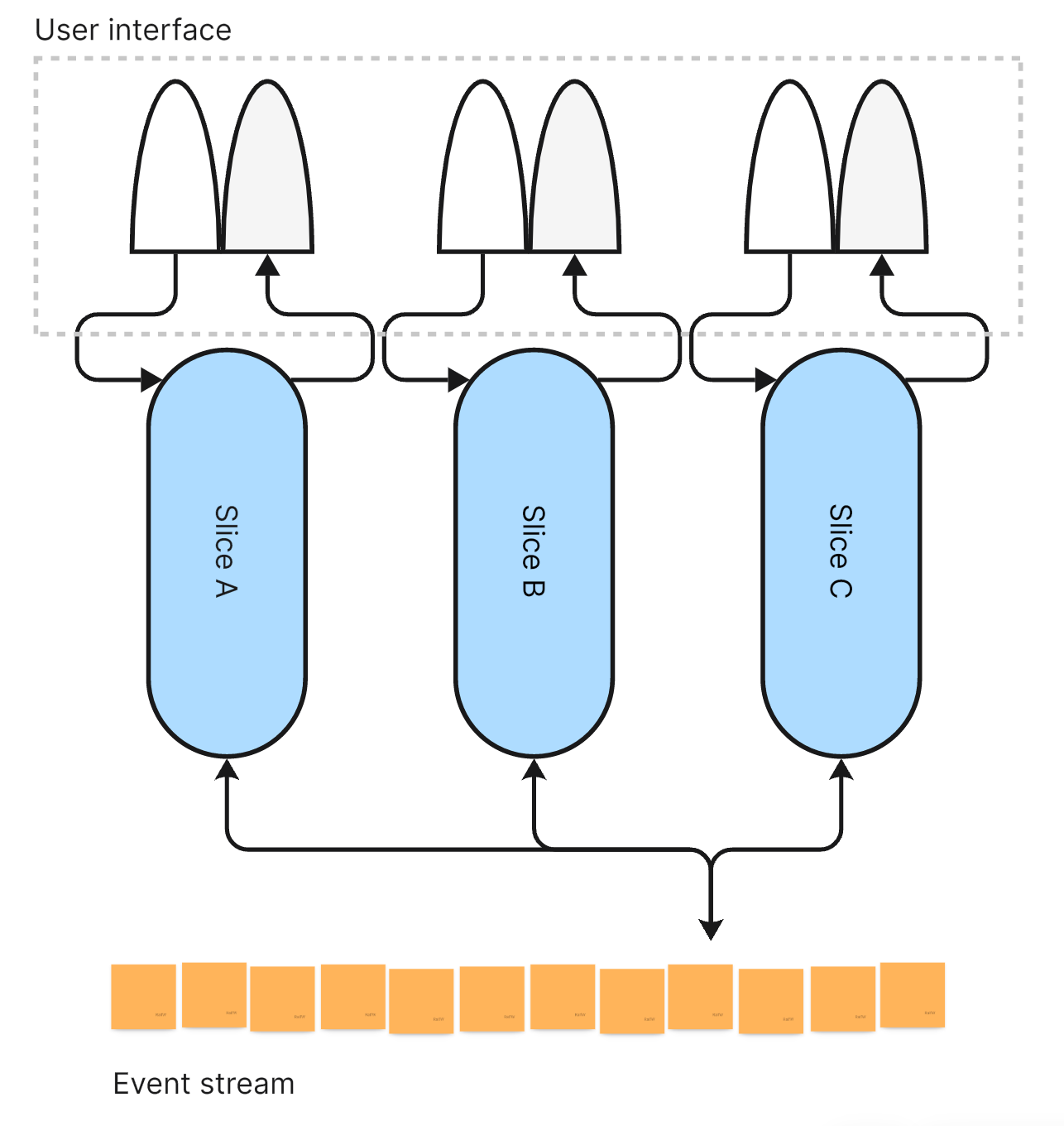 Slice service the user interface. Slice append to and query the ever growing event stream. The application state primarily resides in the event stream. It’s the single source of truth regarding the application state now and at every moment in the past.