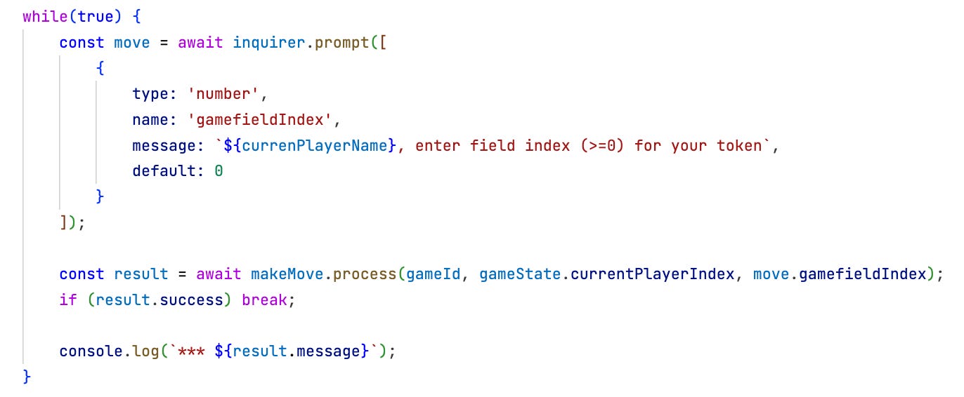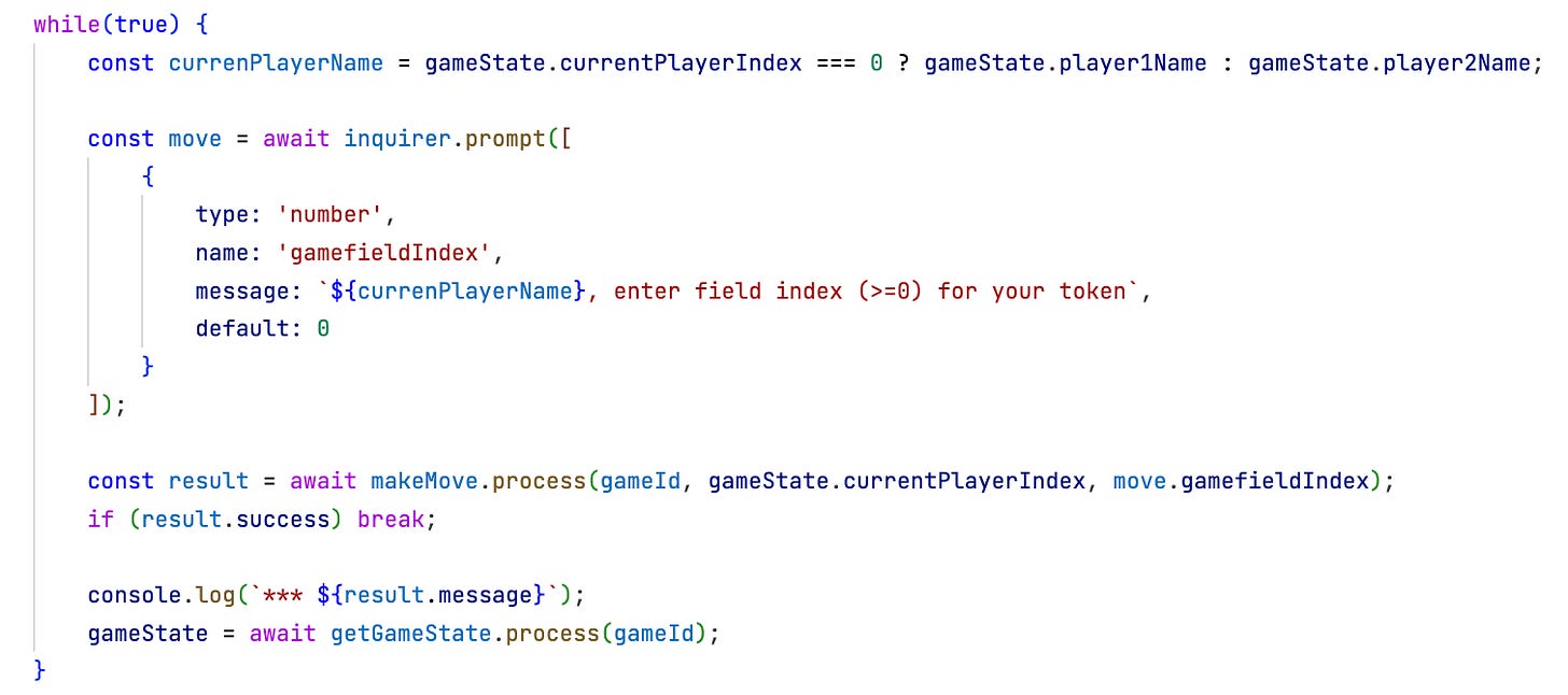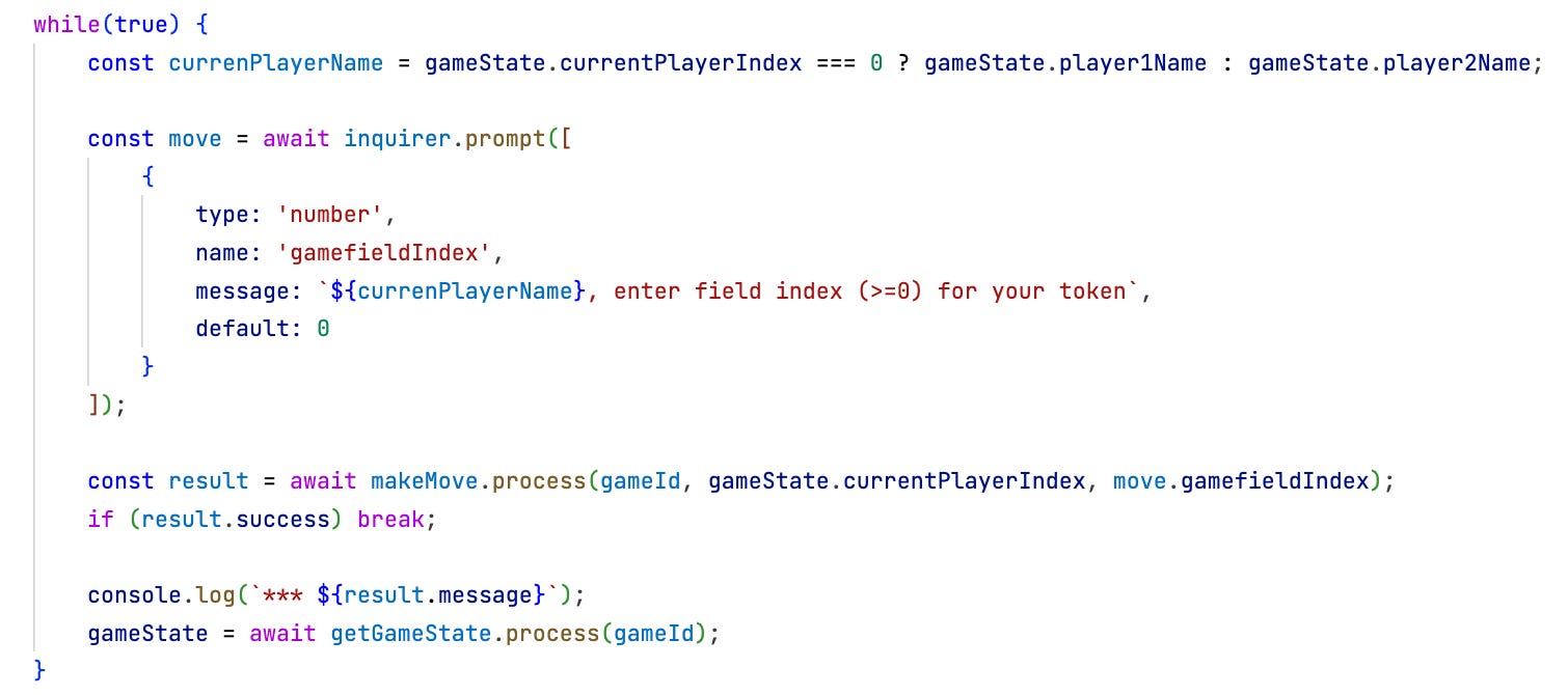 This unexpected technical problem solved there is only one thing left for the user interface: the game state has to be loaded again after an invalid move since the current player might have changed.