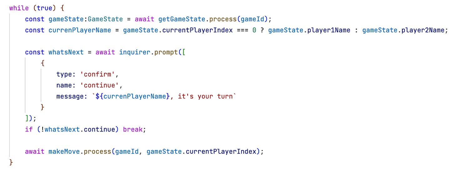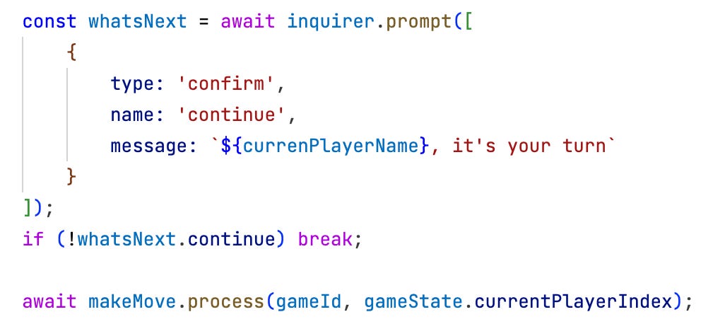 Without knowing much about the game Darline decides to let the players move by just hitting ENTER. If a move is more than that in the future, she can adapt to that in the UI. At least this way she knows when a move has been made and there is some interaction involved.