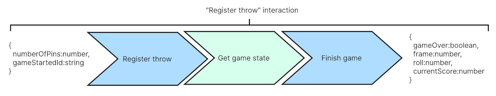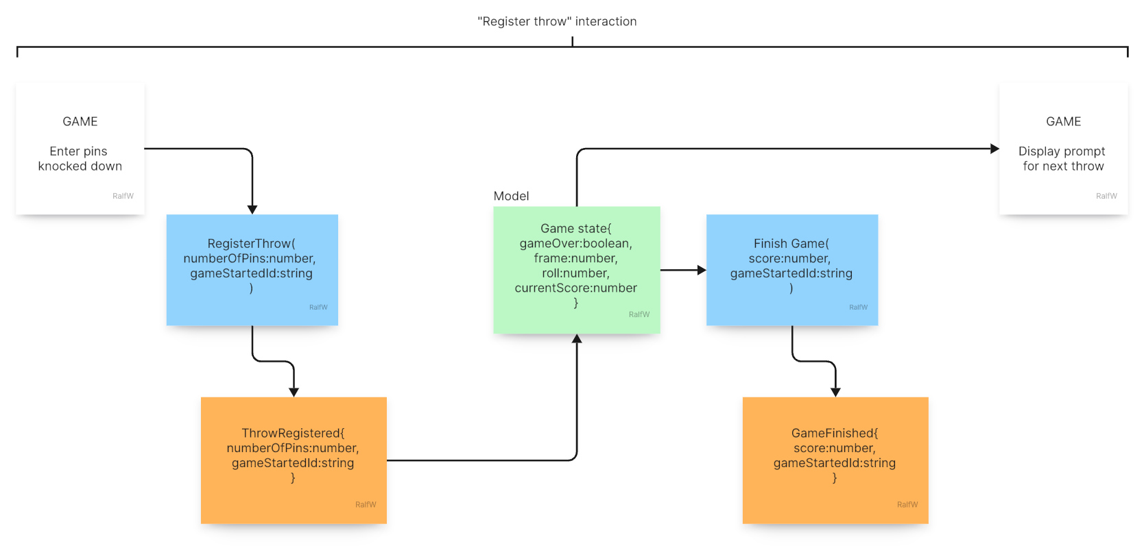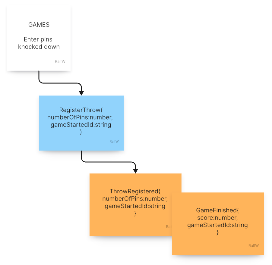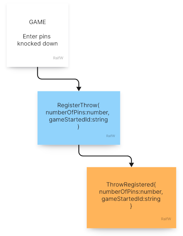 RegisterThrow(numberOfPins:number, gameStartedId:string): The command records the fact of a certain number of pins knocked down during a game:ThrowRegistered{numberOfPins:number, gameStartedId:string}. The game is the scope here. That’s why thegameStartedIdis passed in. It’s the id of the event with which the game was started. All throws in the game belong to it. They happen inside its scope. The game is like an umbrella spanning all throws. A throw only makes sense as part of a started game.Query: Part of the interaction is the same query as in the previous one. After a throw got recorded the game continues with a next throw (until it’s over). The player needs to get prompted again.