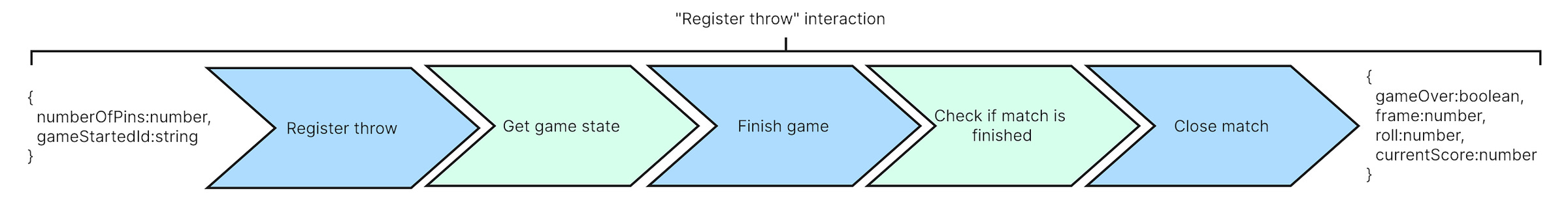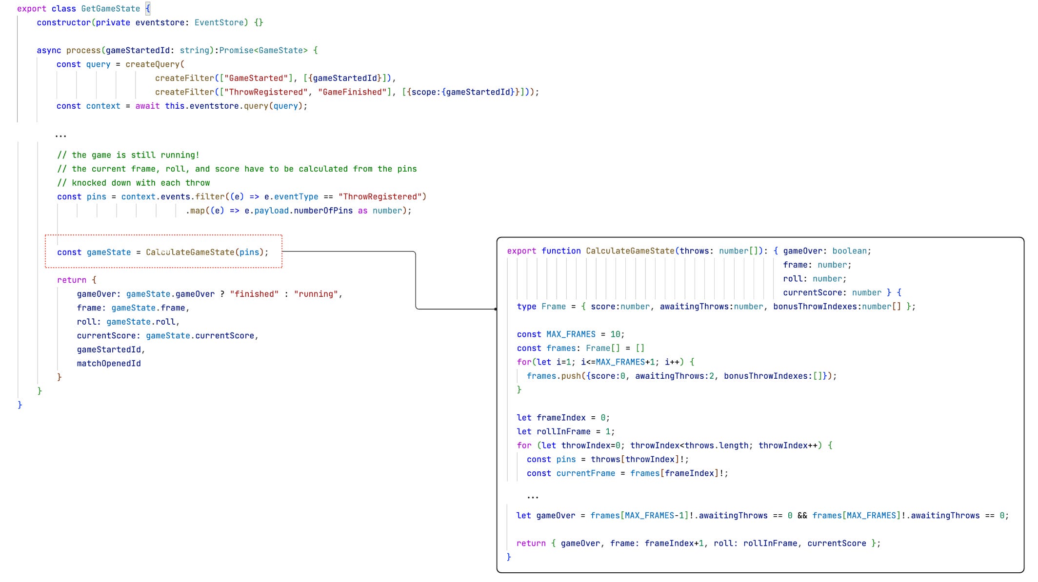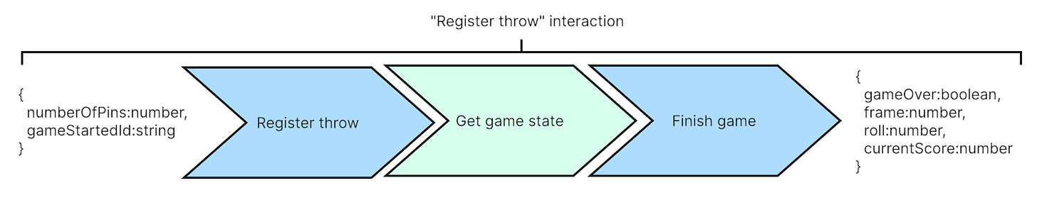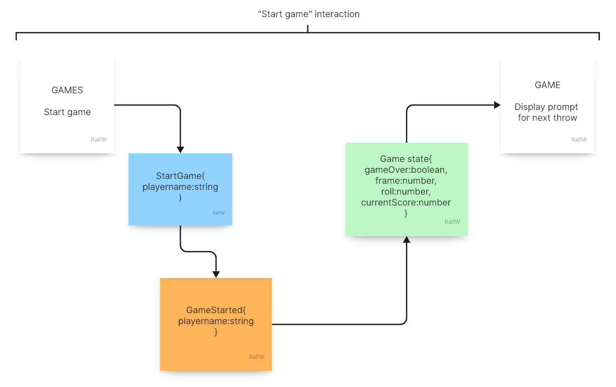 RegisterThrow(numberOfPins:number, gameStartedId:string): The command records the fact of a certain number of pins knocked down during a game:ThrowRegistered{numberOfPins:number, gameStartedId:string}. The game is the scope here. That’s why thegameStartedIdis passed in. It’s the id of the event with which the game was started. All throws in the game belong to it. They happen inside its scope. The game is like an umbrella spanning all throws. A throw only makes sense as part of a started game.Query: Part of the interaction is the same query as in the previous one. After a throw got recorded the game continues with a next throw (until it’s over). The player needs to get prompted again.