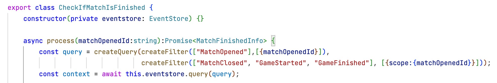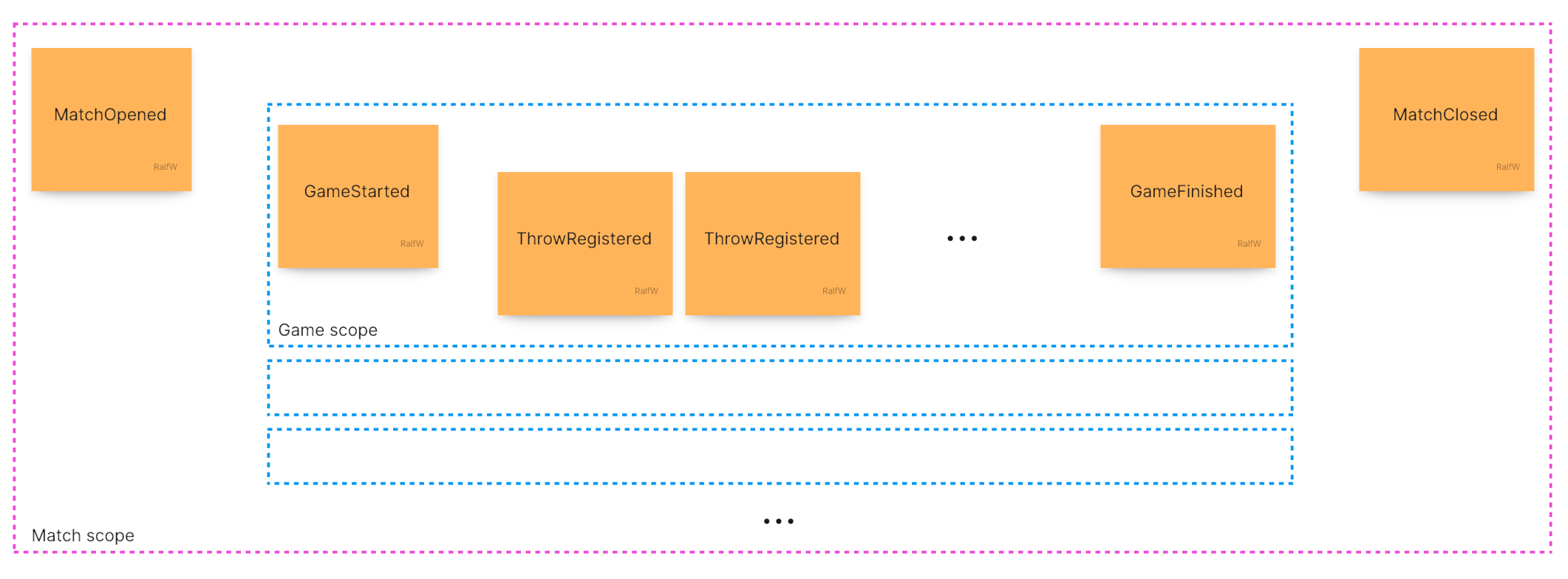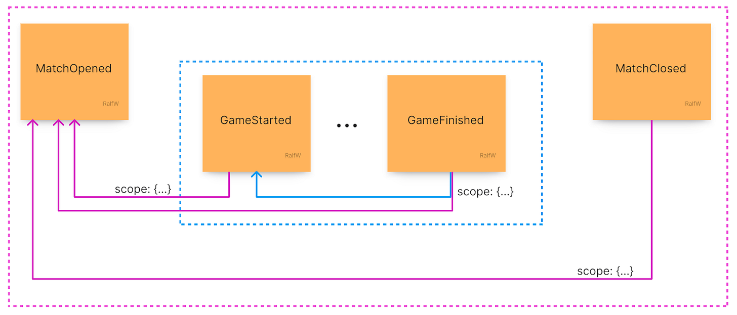 GameFinished, though, is not directly part of the MatchOpened scope. Its scope root is GameStarted which is creating a nested scope. Nevertheless GameFinished is indirectly part of the MatchOpened scope. That’s why it too includes matchOpenedId in its scope and can be queried for like GameStarted.