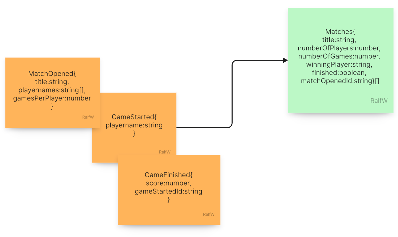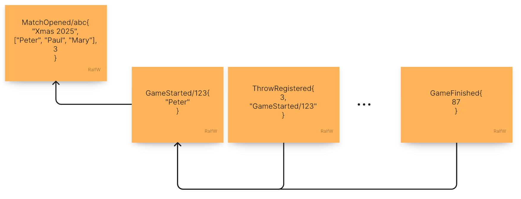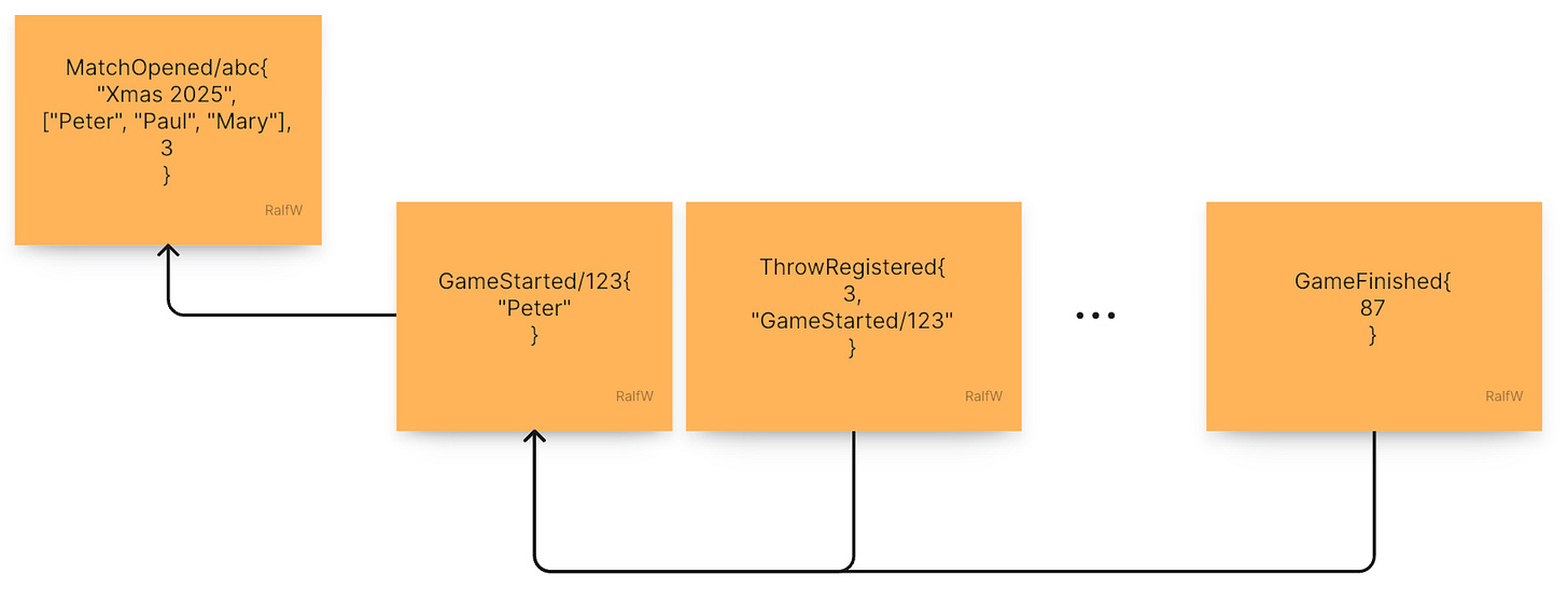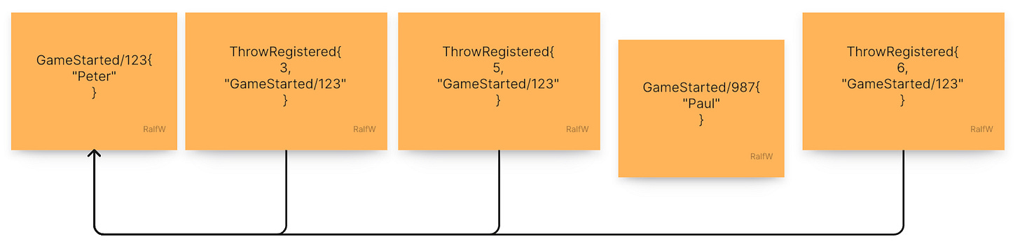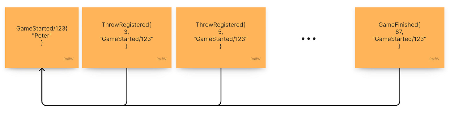 Since here the structure of an event is sticking out let me quickly explain how scopes are implemented. Remember: Each event can be the root of a scope, i.e. a “space” containing related events. Above the GameStarted event is opening such a scope. But that does not have to be planned; it’s a matter of subsequent events like ThrowRegistered. If they refer to an upstream event, that event “retroactively” becomes a scope root.