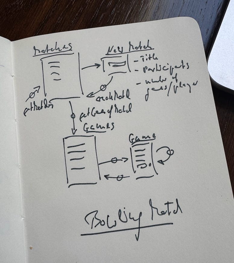 In the following image you see a snapshot of a sketch of what the (imagined) user and I came up with while going through the bowling match requirements: