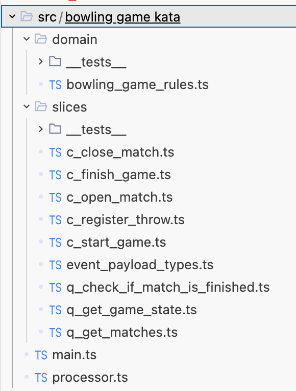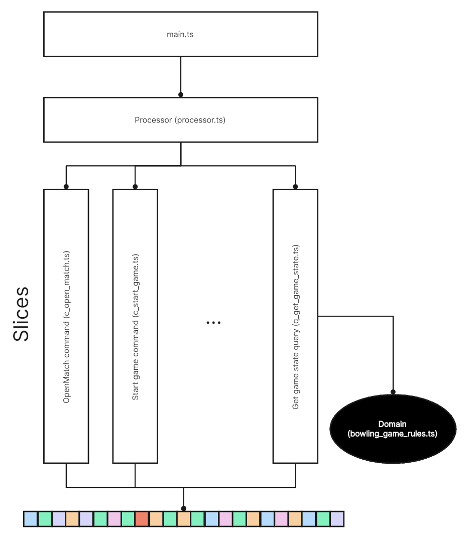 Some slices (queries, to be precise) are not self-sufficient. They call domain functions in a separate module, e.g. for calculating the current game score. All domain functions are pure functions.
