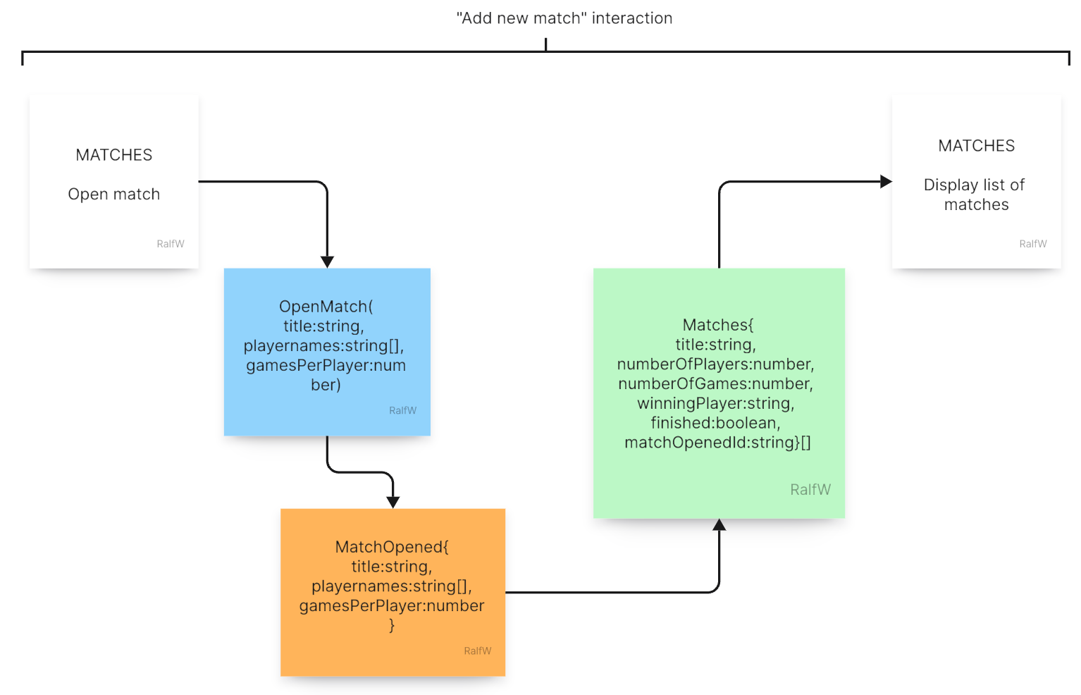 OpenMatch(title:string, playernames:string[], gamesPerPlayer:number):{matchOpenedId:string}: The match is set up with a number of players each playing the same number of games. The games themselves are not yet started, though. This happens only on demand (see interaction above). A constraint on this command could unique player names.Query