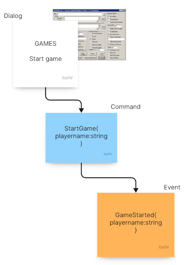 But else? Any additional events that come to mind when thinking about the command? What about the score? Should the game be started with a score, e.g. GameStarted{playername:string, score:number}? I don’t think a score should be part of the fact that a game was started.
