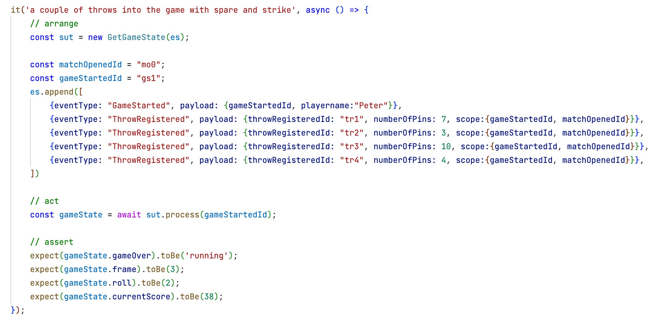 Since an event store “database” is so easy to implement it can be kept around in two versions: a persistent one for production and a functionally equal one working just in memory. The latter one can be used for testing where it’s populated inside the test with the events needed to check the system under test. See this example from testing the GetGameState query: