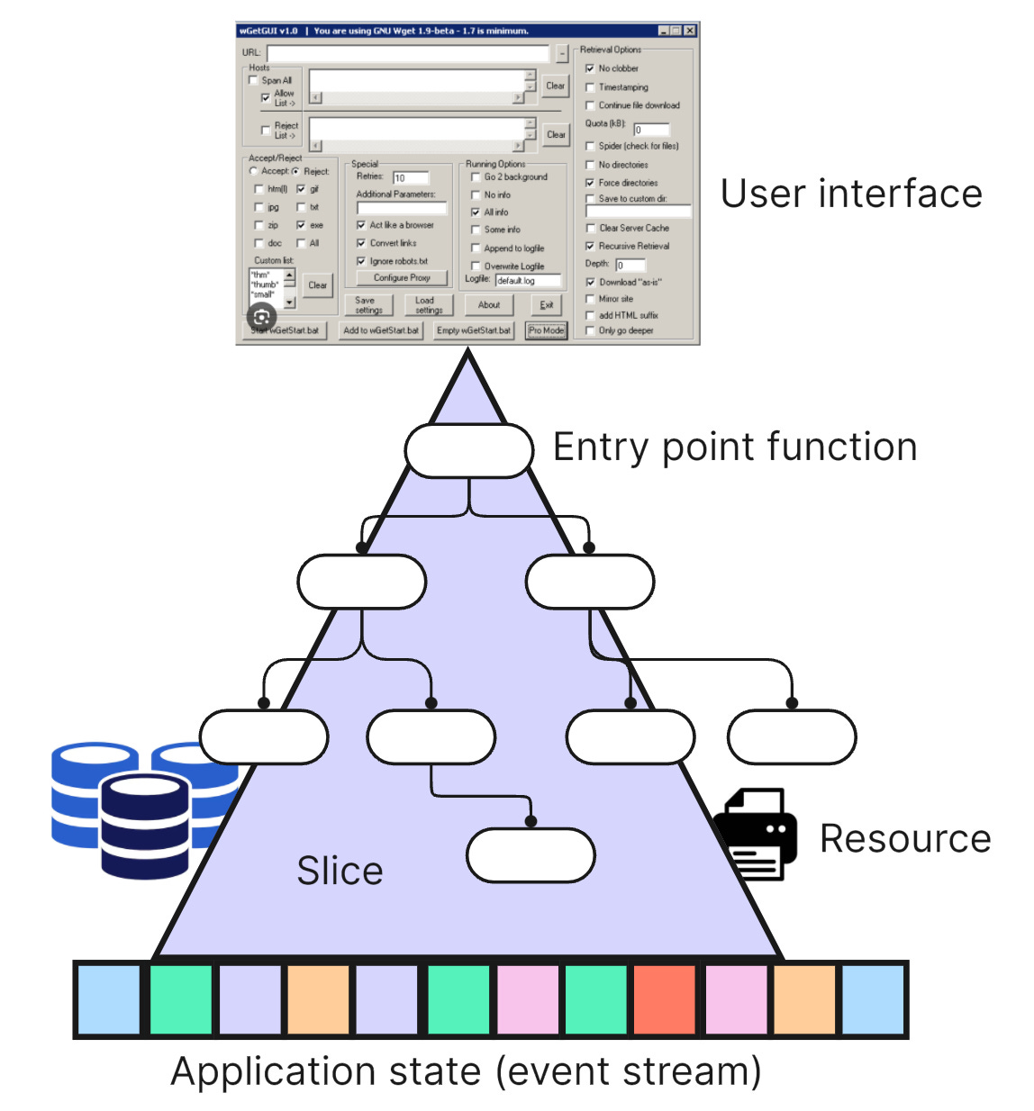 It’s made up of independent slices each responsible for responding to a trigger event initiated by a user. Slices (ideally) are not knowing of each other; they are not services to each other. Their only connection is through a common, very primitive “data substrate”, an event stream.
