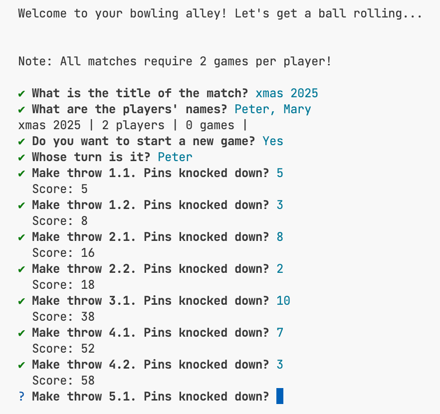 Once a game is started, the application should ask for a player to make a throw and enter the pins knocked down. Our little application unfortunately cannot be connected to bowling alley’s machinery and know the number of pins by itself.