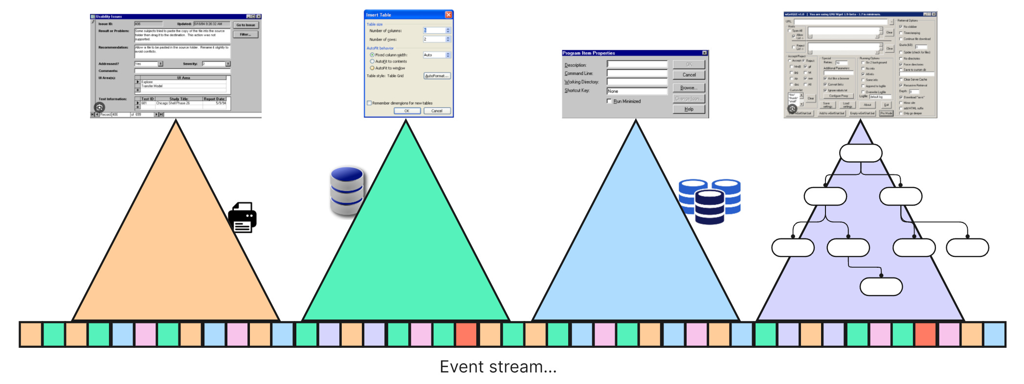 The initial goal for me is to find the triggers where users kick-off processes, some very short, others more long running. When do users “send a request” to be handled by the application? Which buttons do they want to click, which menu items to select, which keys to press in order for the program to execute a processes changing or reading the application’s state?