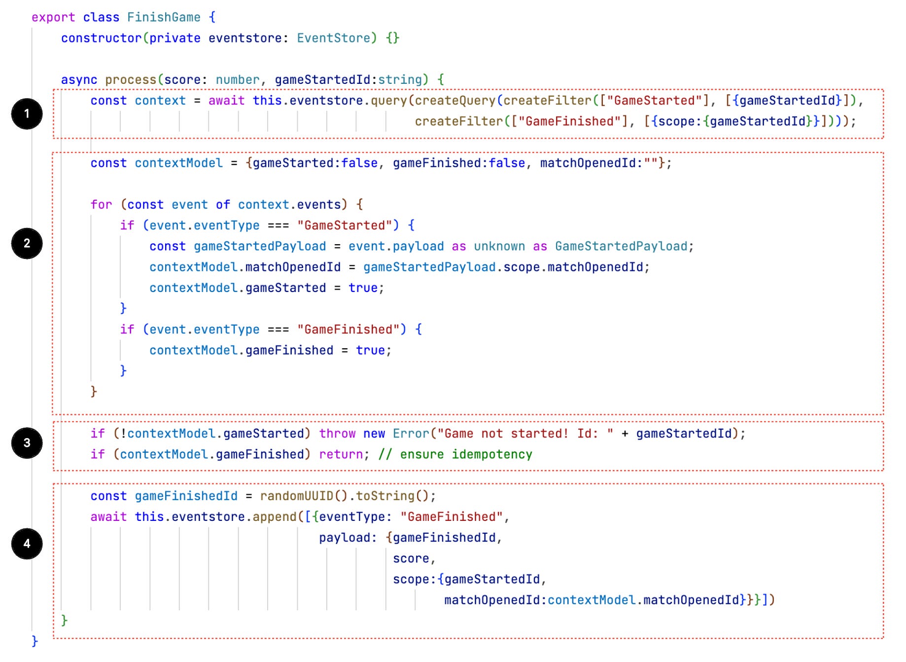 I am separating the generation of the events ThrowRegistered{} and GameFinished{}. There should not be just one command for both, but two, with the new one being FinishGame(score:number, gameStartedId:string). These commands should be handled in sequence. The interaction is triggering a process with several steps: