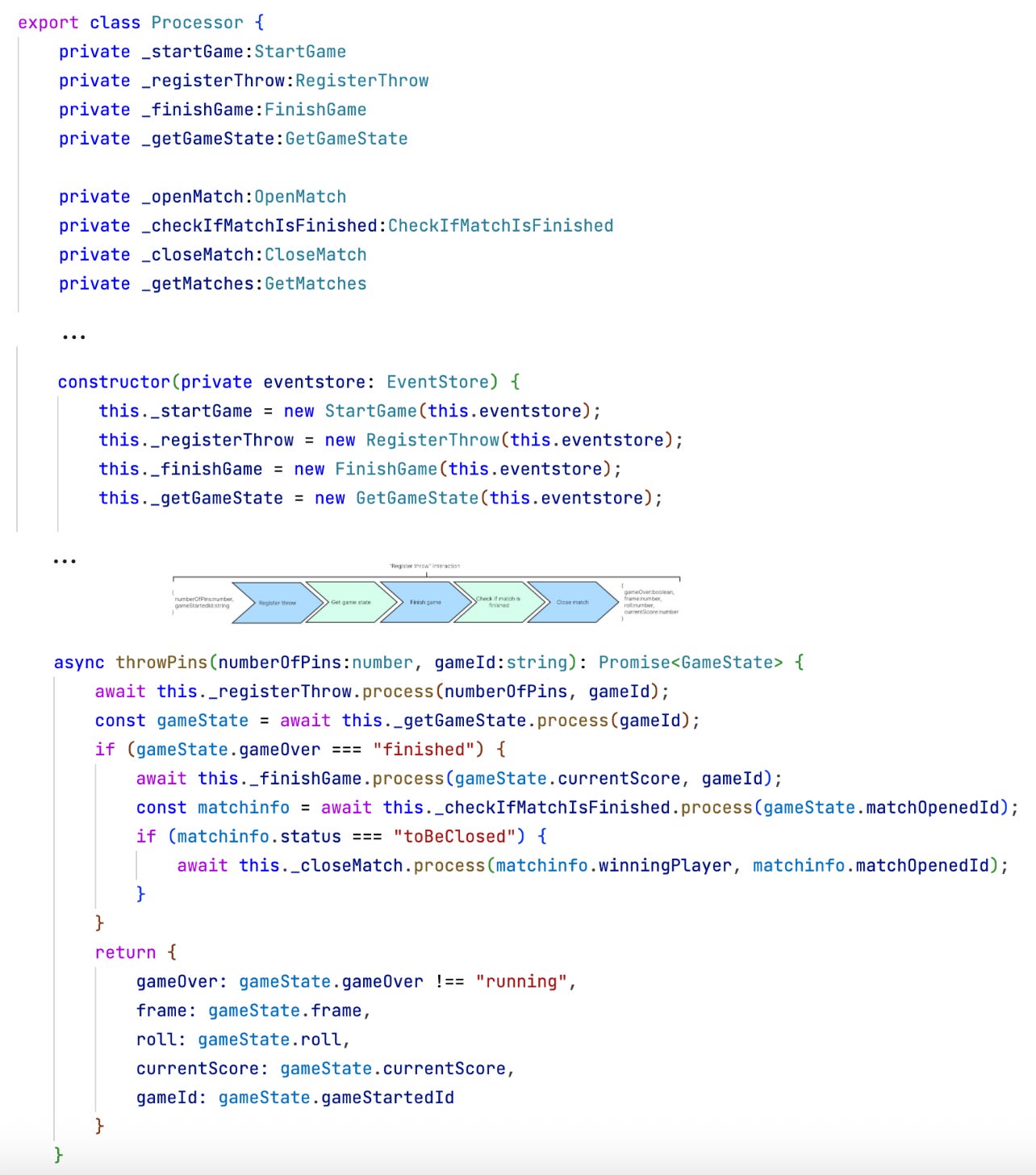 Commands and queries are integrated by the Processor into interactions. It hides the details of composing slices into workflows. To its client it presents a clean interface without any trace of event sourcing. As an example the “Register throw” interaction (sorry for the rename to “throw pins” in the code).