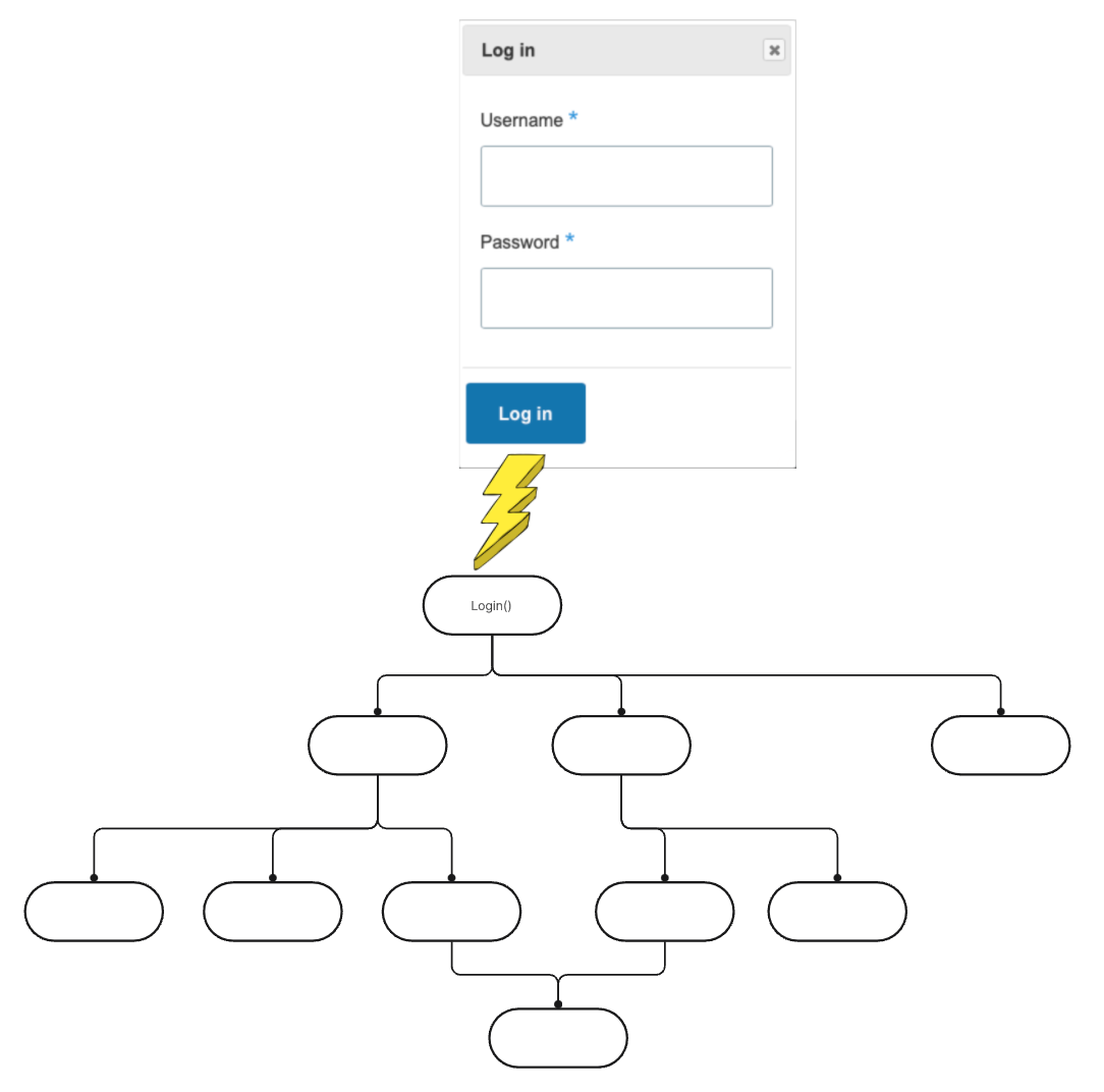 These functions triggered by users are the entry points into the logic creating the desired behavior. They are the roots of deep function trees across which this logic is placed, scattered, smeared.