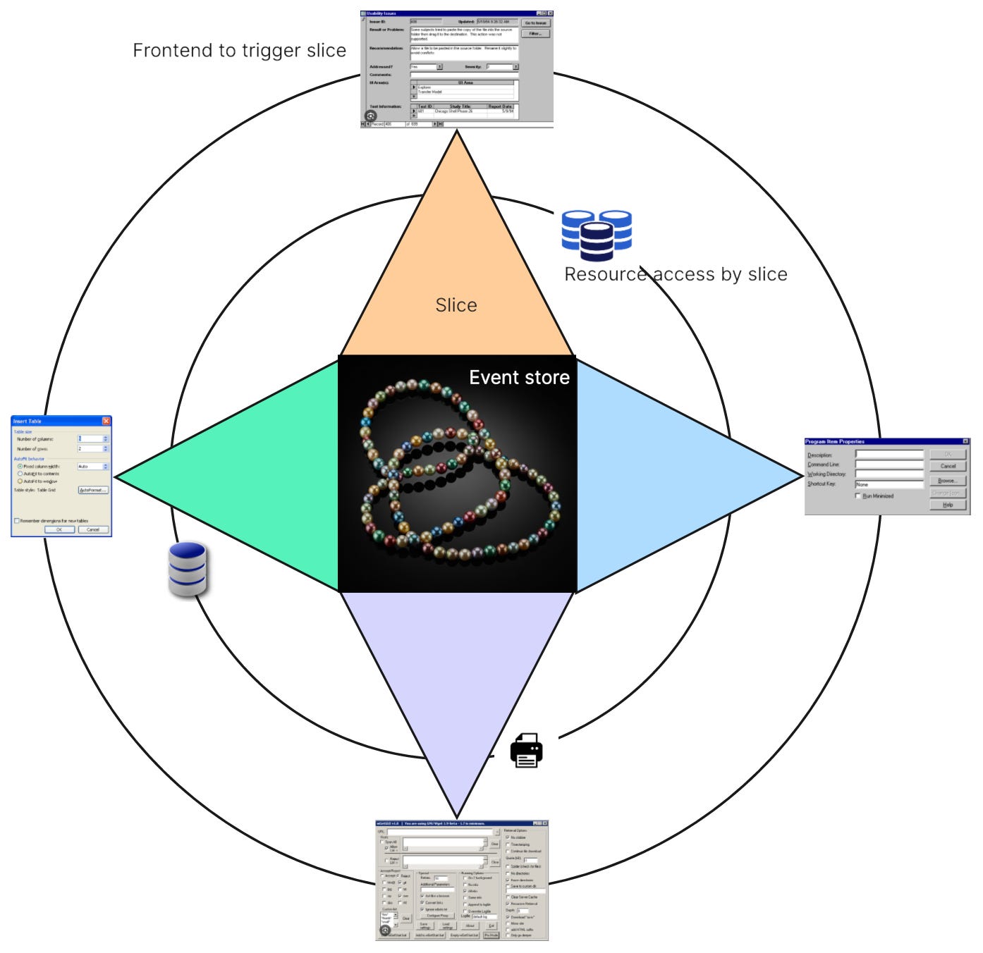 And at the core there is the event store. All slices of the interior have access to this raw, fine grained stream of facts. They either extend it by appending events or they query it for a subset of relevant events.