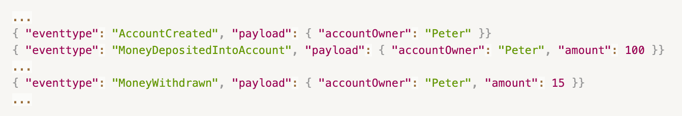 The event stream records, well, events, i.e., whatever happened in (or to) the application. It’s a logbook of facts created by decisions made by the application’s logic. Events describe differences in the state of the application.
