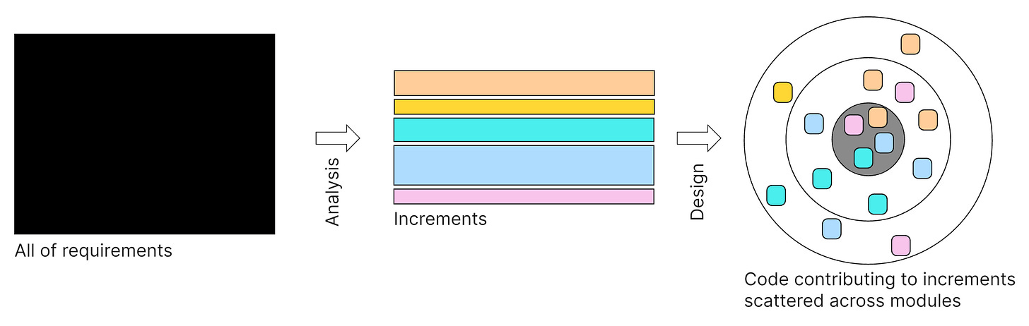 That’s why, to me, SoC-based architectures are primarily technical. They are concerned with separating certain cohesive logic for easier testing and easier adaptation, but still, this does not have anything to do with increments. The neutral concept of a module is used for a technical, cross-cutting segregation of logic. The code for each increment is scattered across many modules, with each containing code contributing to many increments.