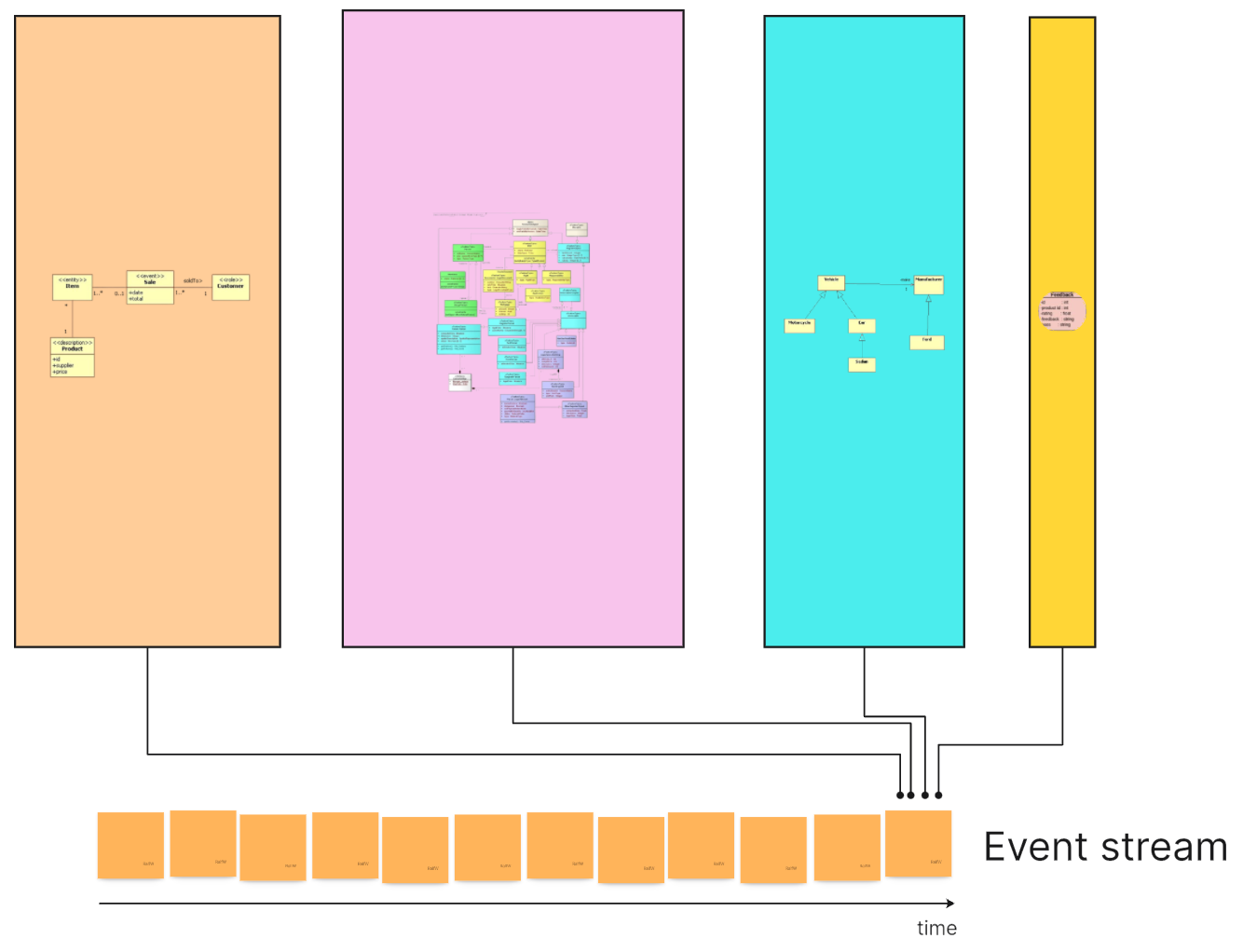 Working with event streams turns this on its head. Events in the event stream are not looking like anything slices are interested in working with to do their job. Events are “empty”, neutral, requirement agnostic. They can be understood as “pure potential” for any kind of data structure slices feel comfortable with.