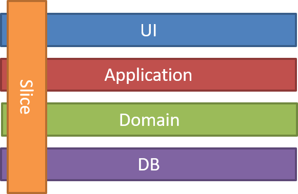 Slices are vertical, layers are horizontal. Slices have turned software design around by 90°. The focus now is on increments all the way down from analysis to code. One slice pretty much does not care about other slices.